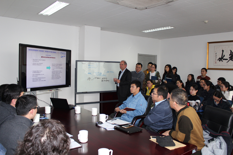 交流会由魏院长亲自主持,杨良会部长及多位博士、硕士参加了本次活动。会上,魏院长致欢迎辞,并叮嘱与会人员要抓住此次机会,了解国际先进的电机系统前沿发展理论知识,并针对实际工作中所遇到的攻坚难题,大胆向Marco求教、学习。小小的会议室里挤满了求知好学的新能源汽车工作者们,他们边听边记并不时提问。互动环节中,与会者就电机转子方案、电机极数选取、PWM频率高度、以及电机反电动势设计应用等方面中存在的疑问与Marco深入交换了意见。最后,Marco给出了在新能源汽车领域中未来电机的发展方向与意见。